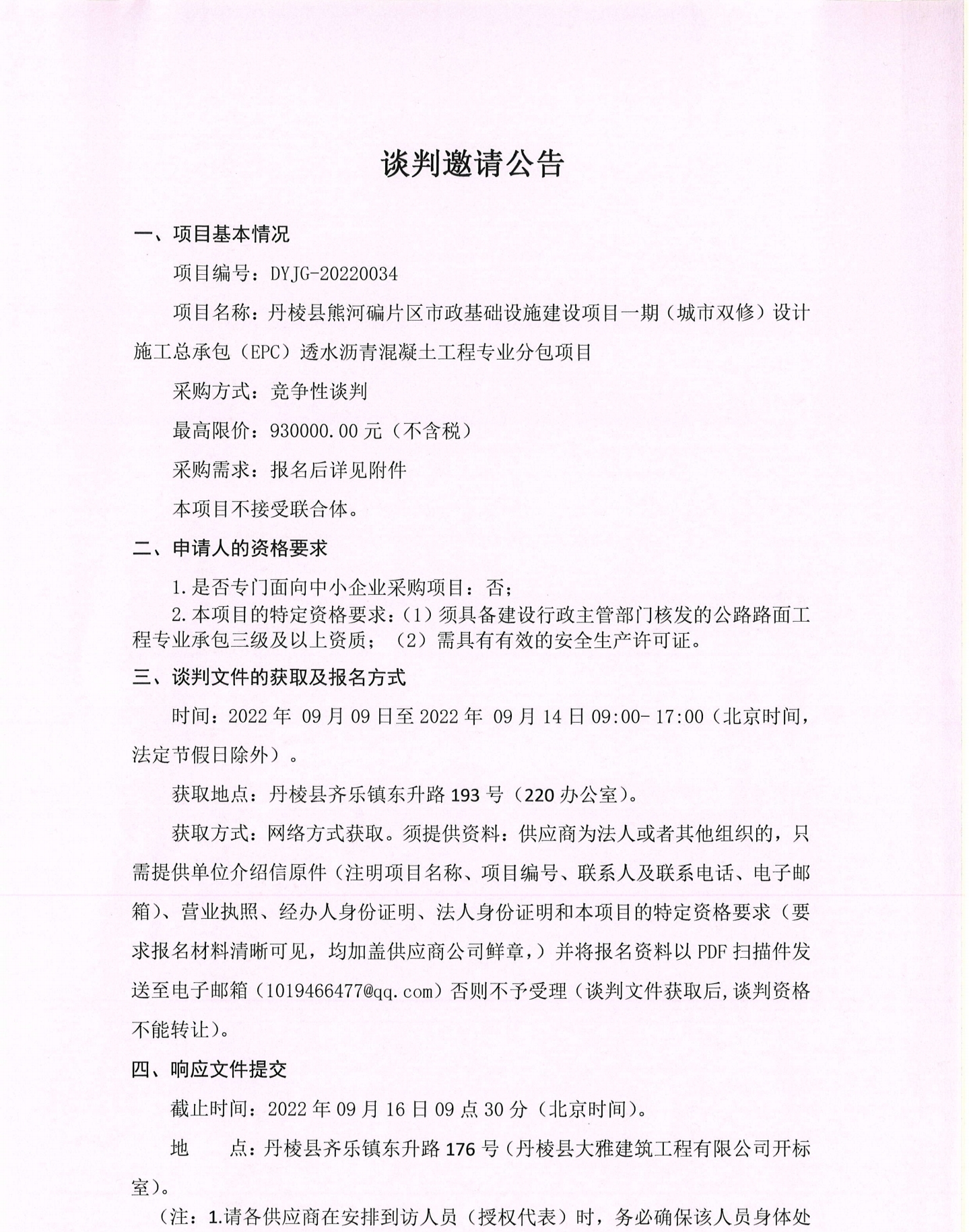 丹棱縣熊河碥片區市政基礎設施建設項目一期(城市雙修)設計施工總承包(EPC)透水瀝青混凝土工程專(zhuān)業(yè)分包項目談判邀請公告